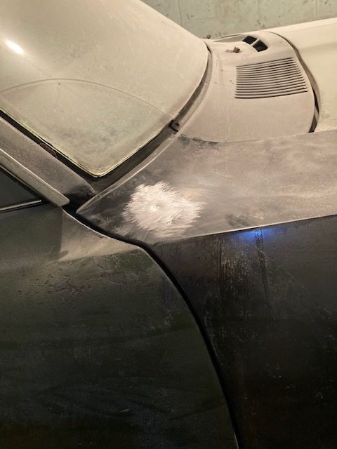 Then the new replacement passenger front fender came with a small defect with a small bulge poking up. I hammered it back down to prepare the fill.