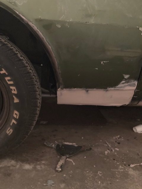 Thirdly, I began patching up the large lower piece on the front driver side fender. We cut out the rusted metal here and welded in new sheet metal several years ago.