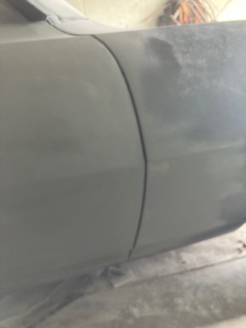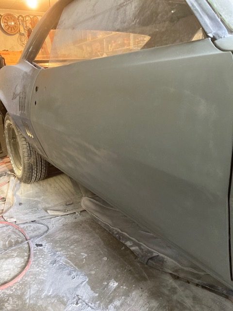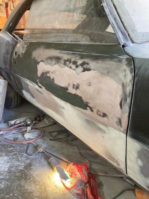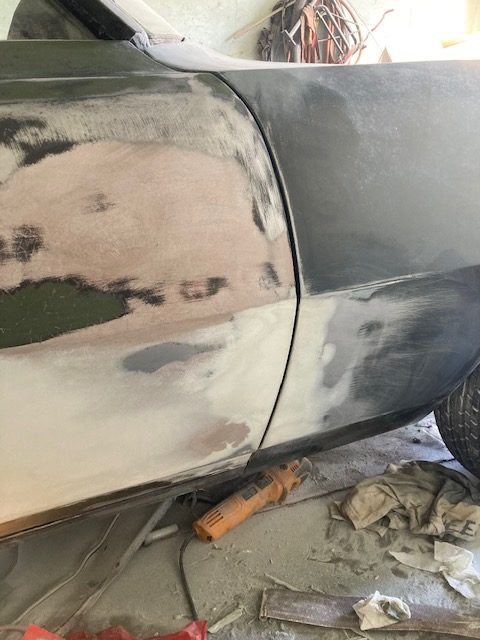 I worked several layers of body putty fill over the panel and eventually got it sanded complete with a long block below.