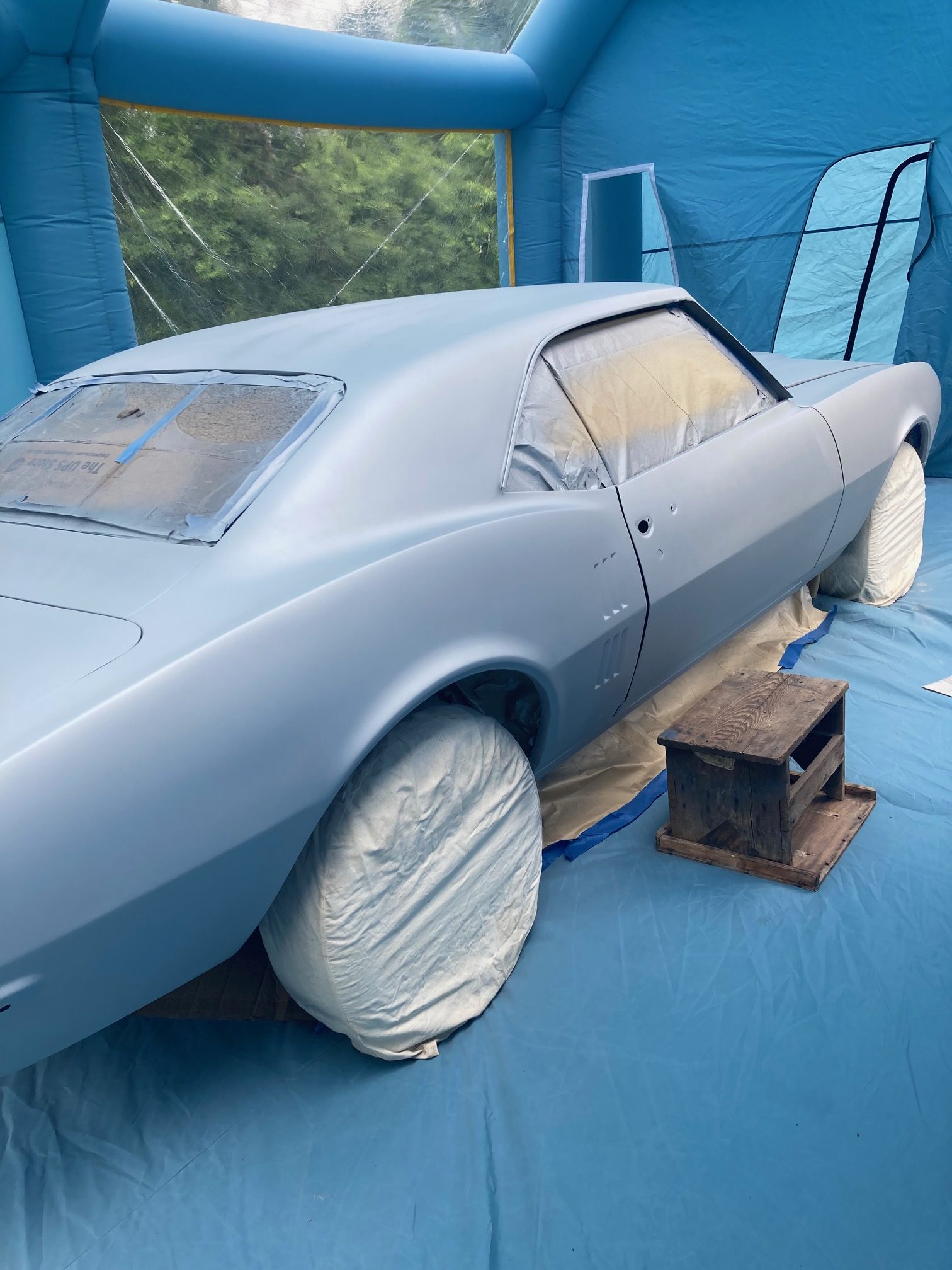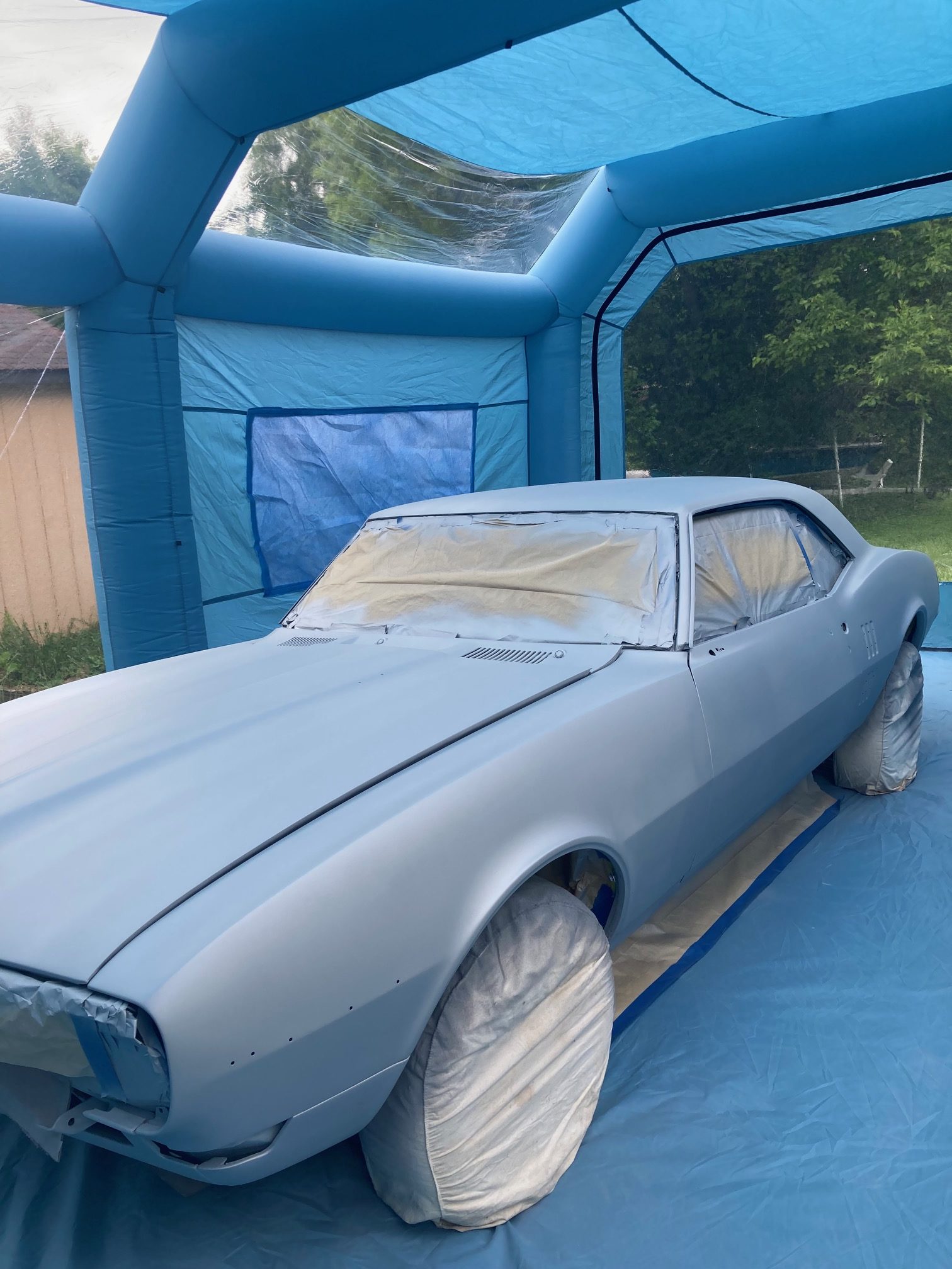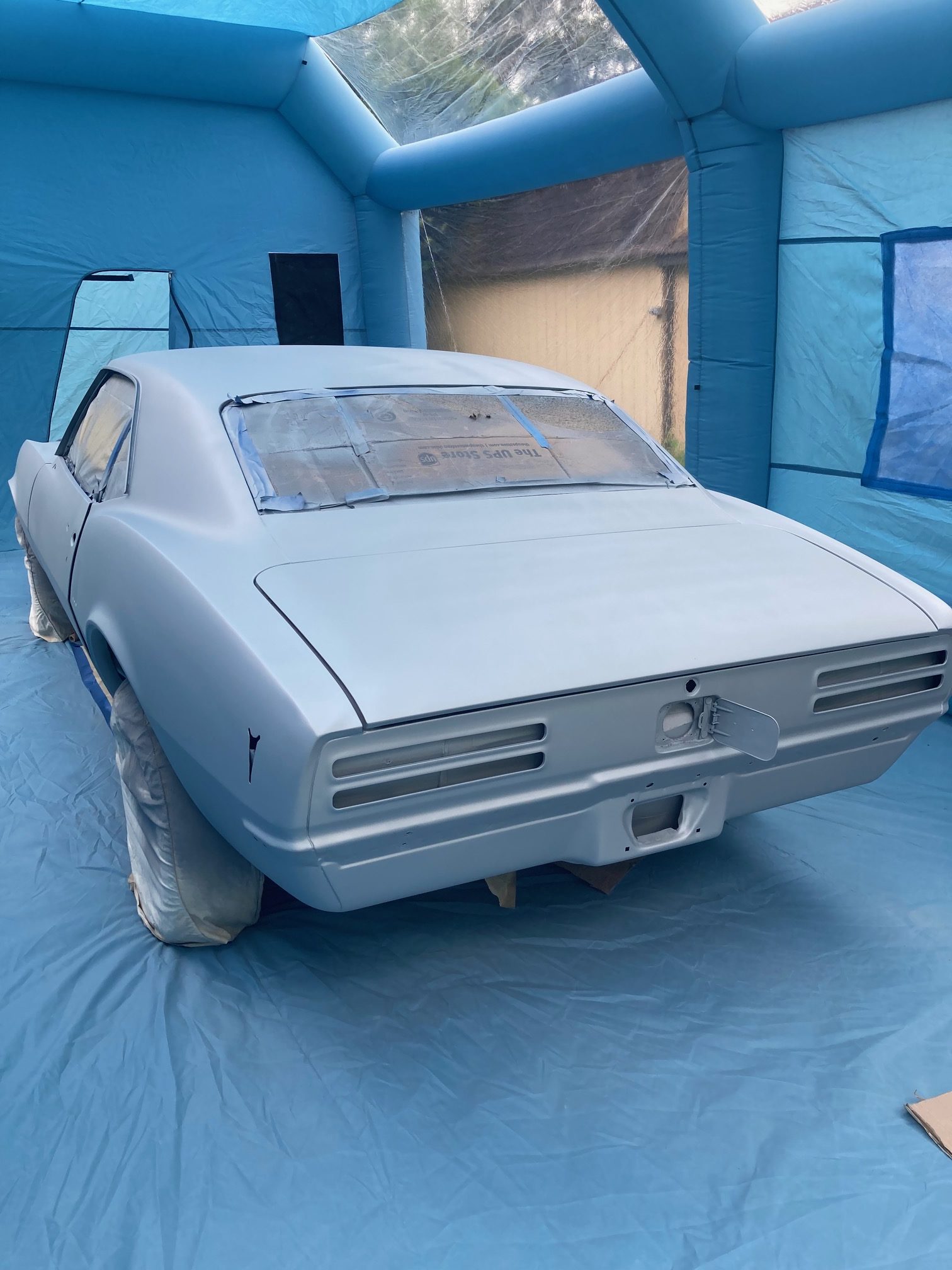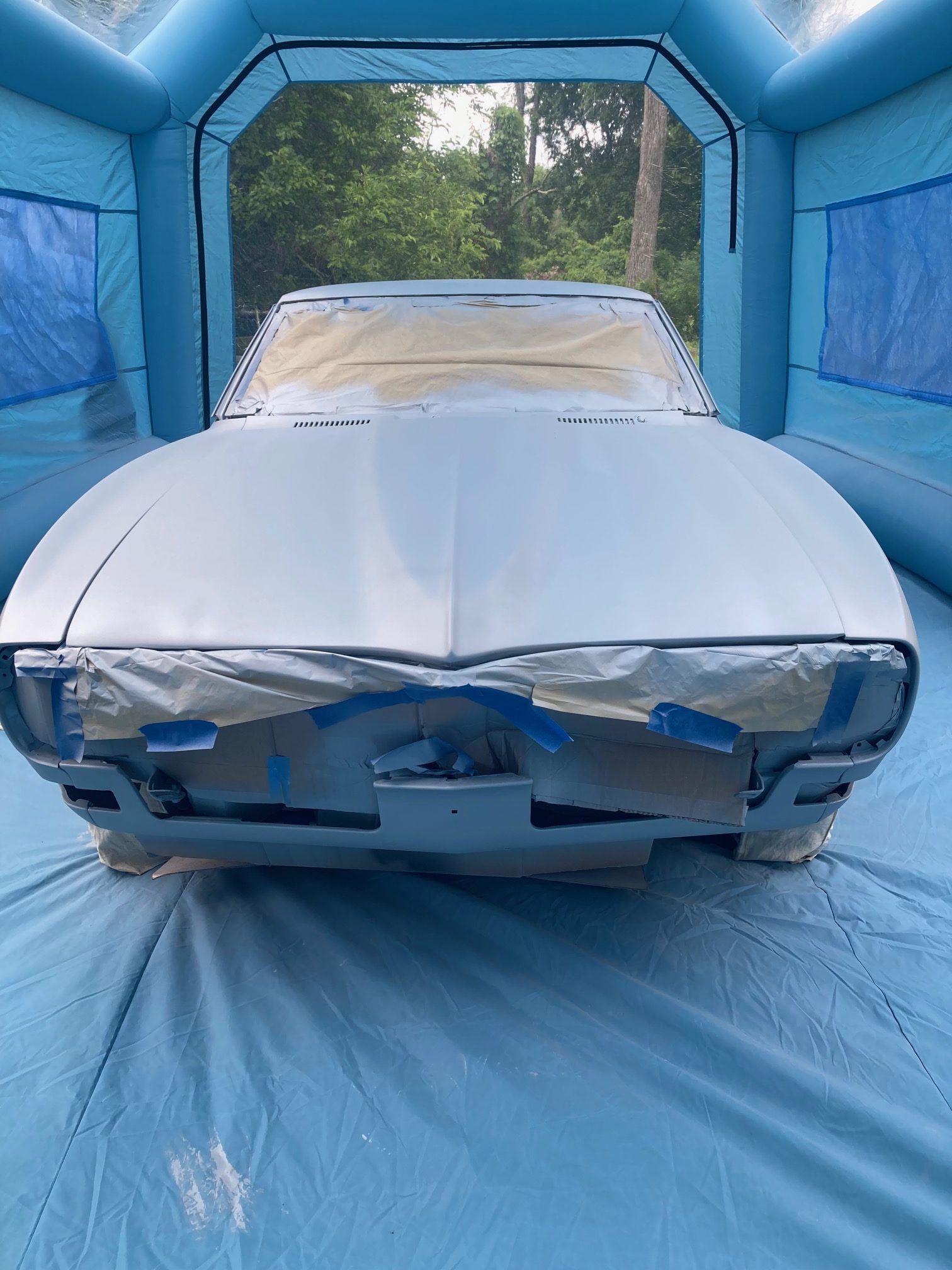 Finally– I got around to painting the car today. I sprayed it with a sealer first, as shown in the below photos. The sealer seemed to spray nicely. I don’t know what I was thinking with the Grey sealer color selection though since it should match closer to the final base coat color which is a metallic gunmetal grey.