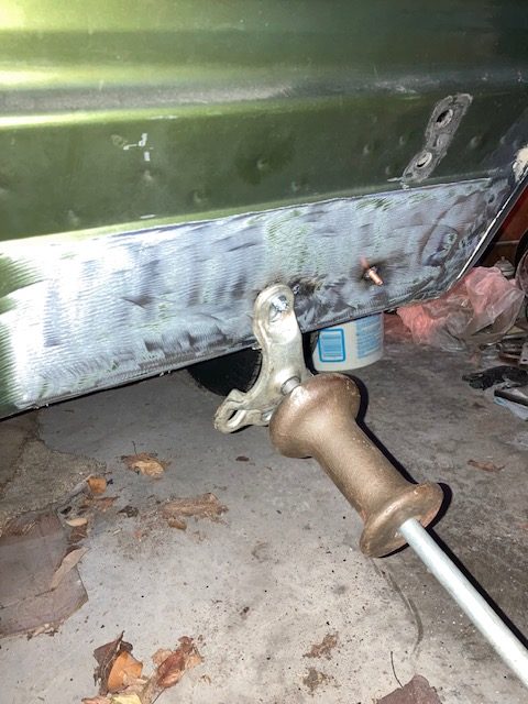 After I welded the studs, I just used a puller and put a nut and washer on the stud to hold it in place. I hammered it back to pull the dent. I welded a half dozen other studs later on to pull the dent better.Then I grinded off the studs for preparation of body putty.