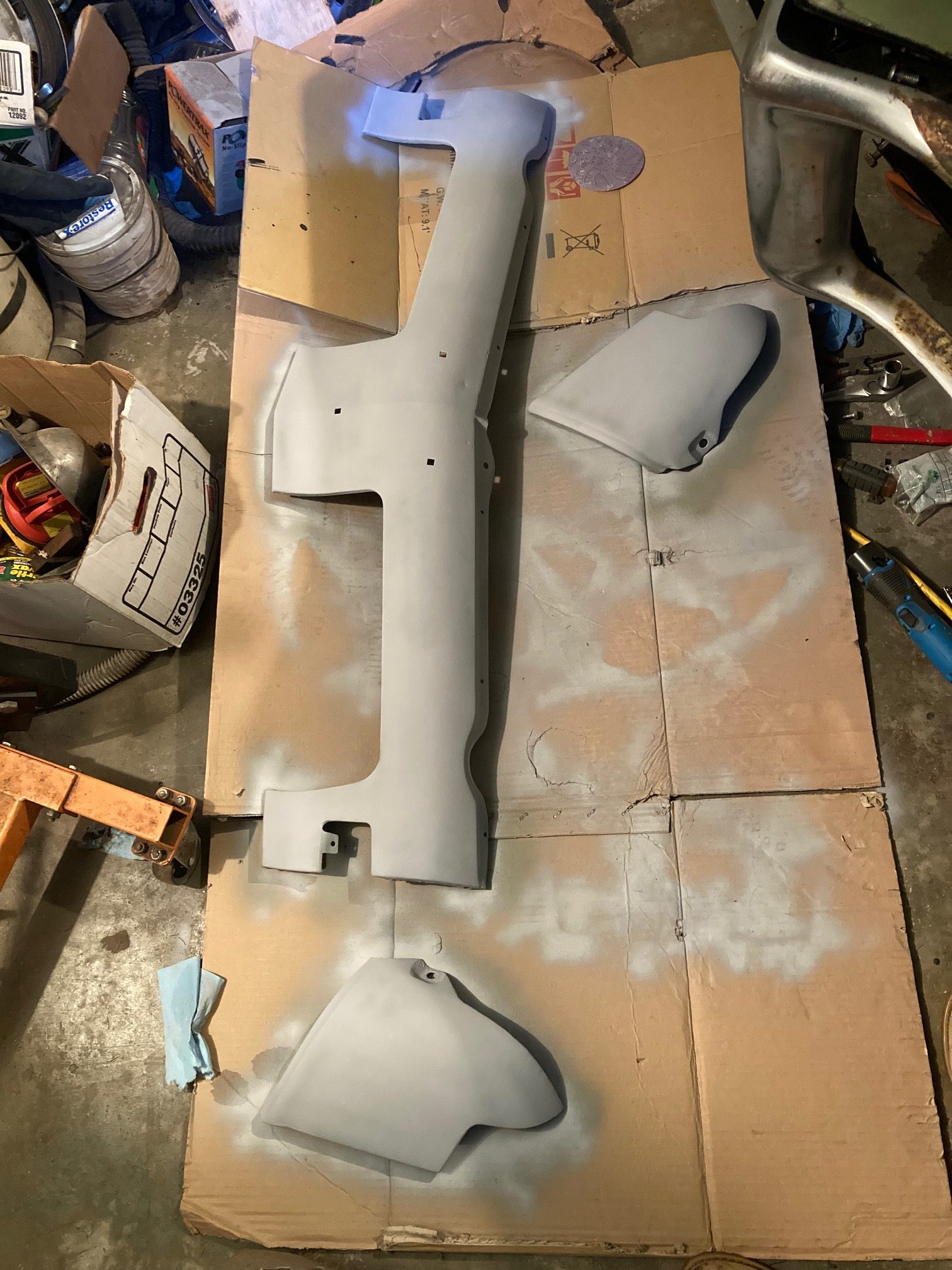 Those rusted front fender extension and valance panel still weren’t perfect so I sprayed them with the special build up filler primer, then sanded and repeated a couple times.