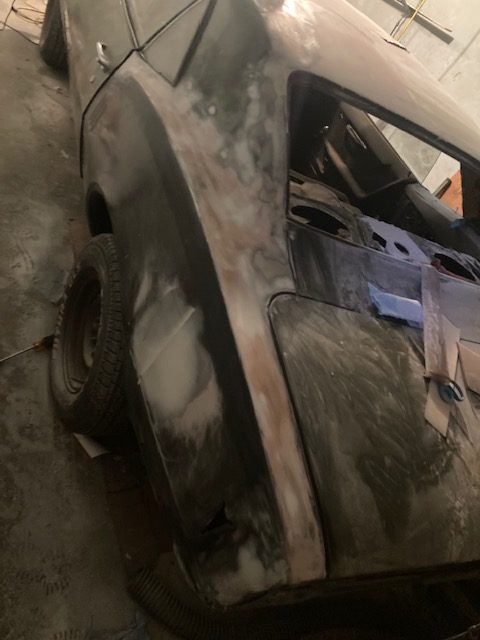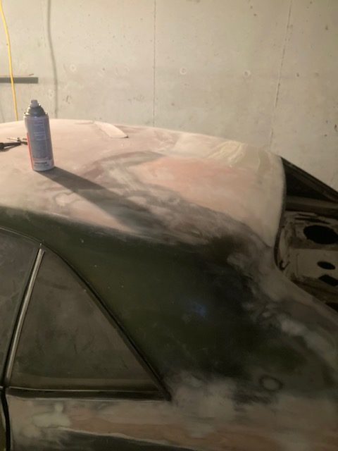 I started to spray guide coat primer over this area, then sanding to better see the low spots visually. Here I started to body hammer the high metal spots down as well and the smooth surface started to come along.